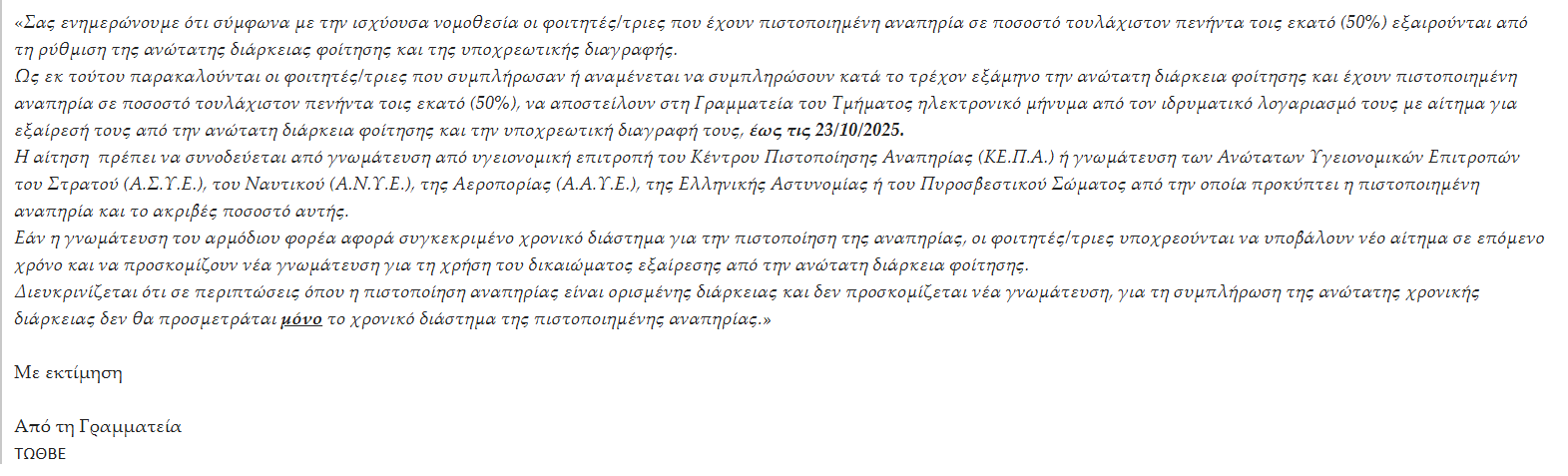 Εξαίρεση των φοιτητών με αναπηρία 50% από την ανώτατη διάρκεια φοίτησης και τη διαγραφή