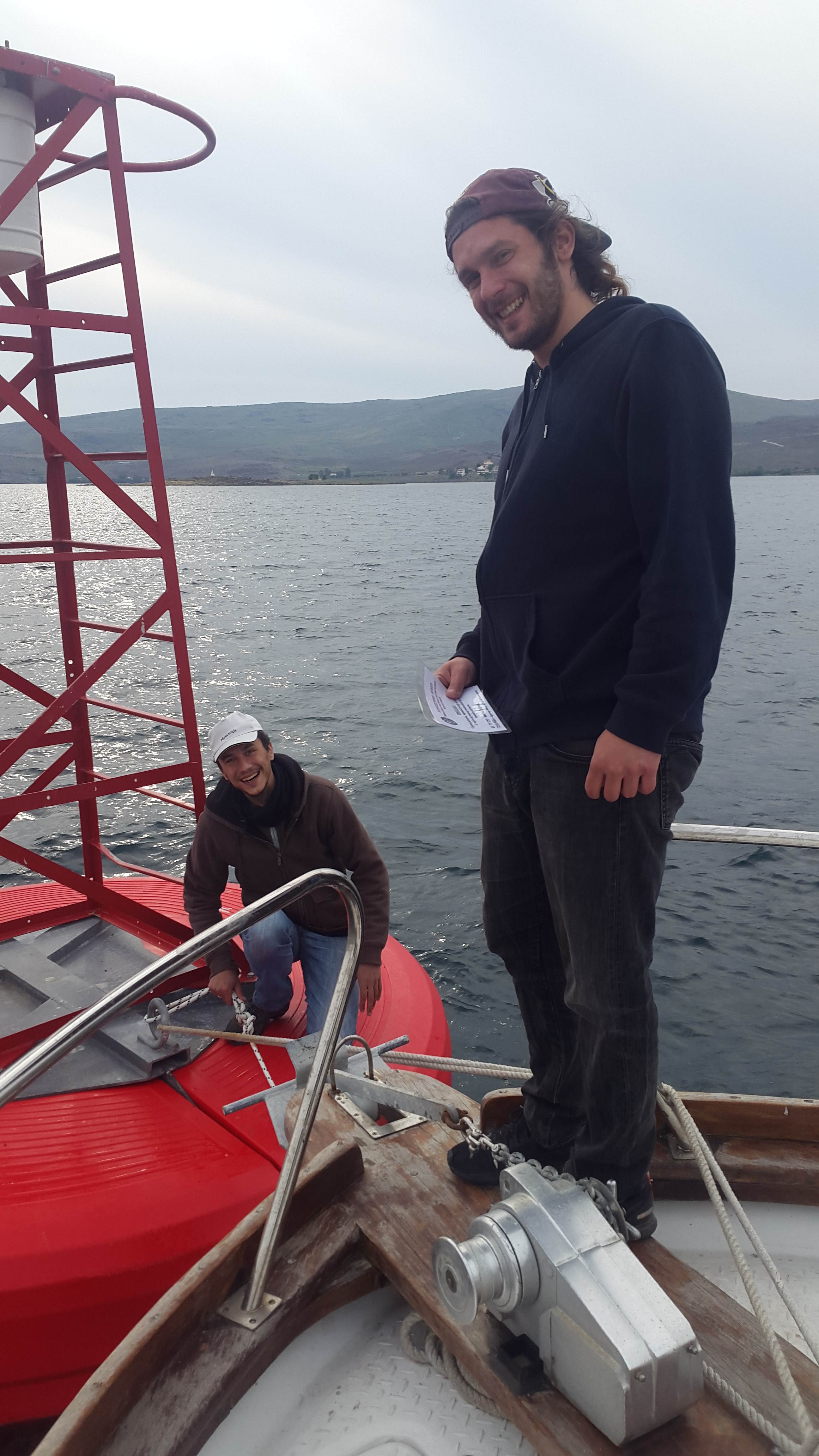 Ph.D. candidates Alexandros Dimitrakopoulos and Stamatis Petalas working on our mooring at Kalloni Bay.